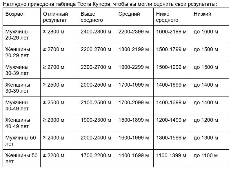 Наглядно приведена таблица Теста Купера, чтобы вы могли оценить свои результаты: