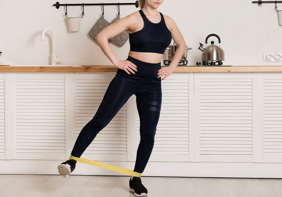 Закріпіть манжету на стопі, тримайтеся руками за тренажер, таз над опорною стопою. Злегка зігніть робочу ногу і виконайте мах назад, спина залишається рівною. Зробіть 3 підходи по 10-15 повторень для кожної ноги.